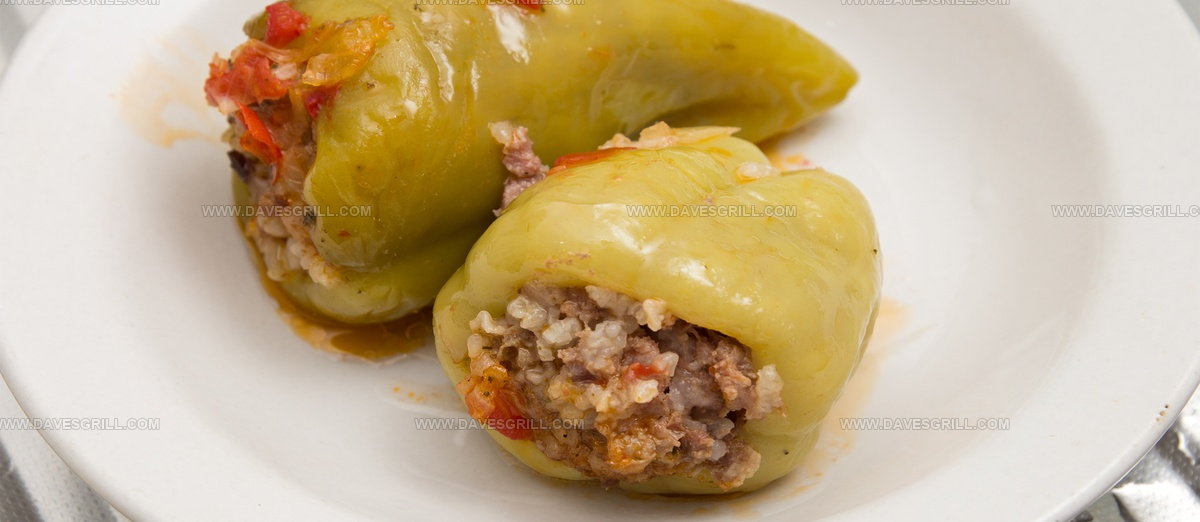 Green bell peppers serve as edible vessels for a savory mixture of veal or pork blended with rice and spices.