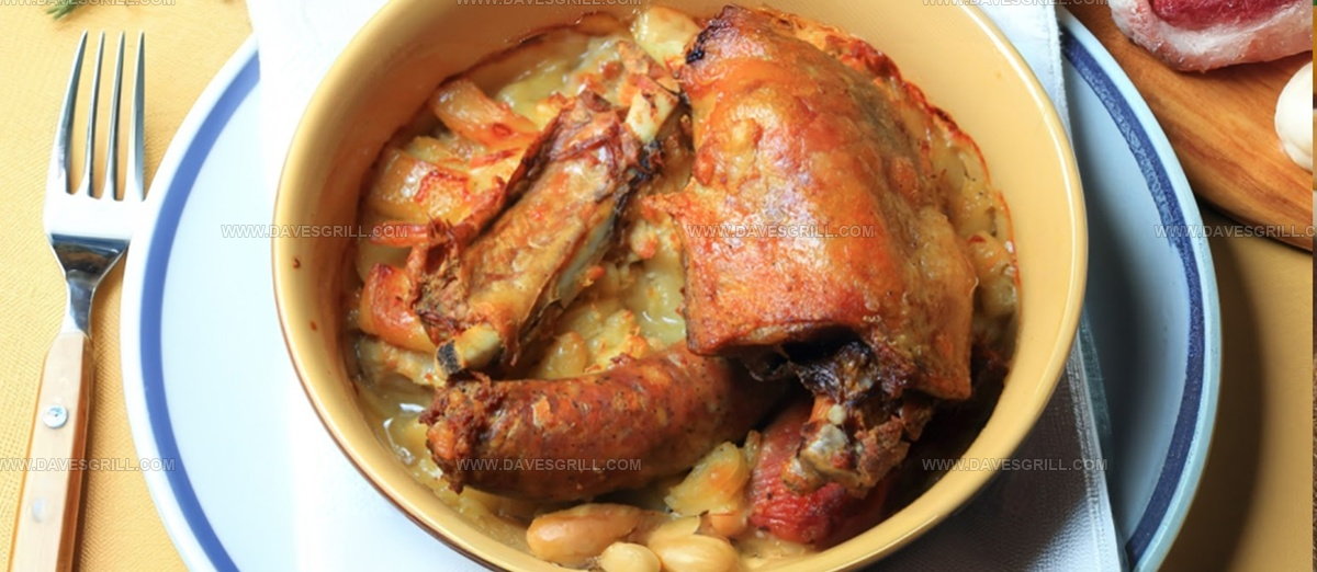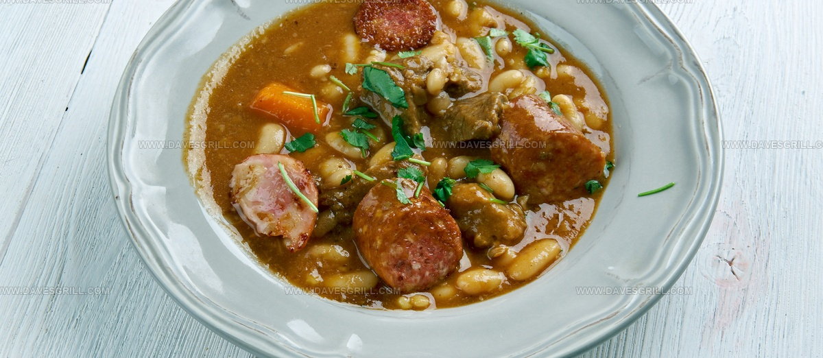 Slow-cooked white haricot Tarbais beans form the hearty foundation of this rustic dish packed with succulent meats like duck confit, lamb, pork, and Saucisse de Toulouse sausage.