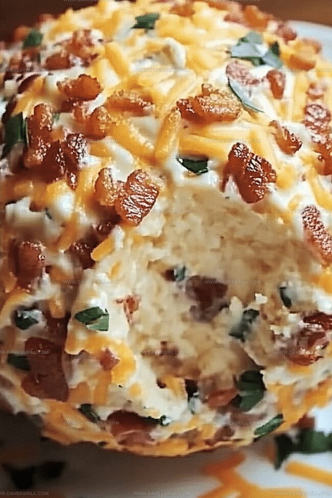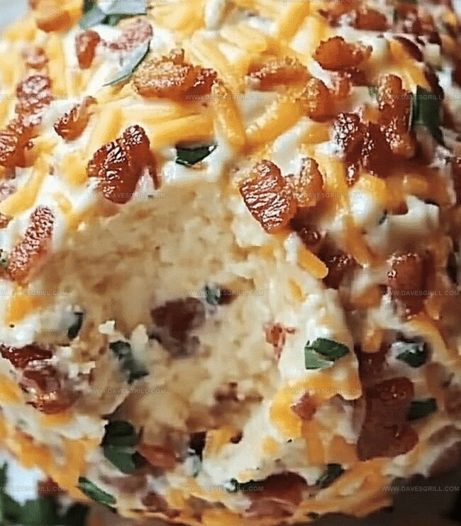 Savory Bacon Cheddar Ranch Cheese Ball blends creamy cheese with crispy bacon and zesty ranch seasoning. Guests will devour this crowd-pleasing appetizer that brings comfort and flavor to any gathering.