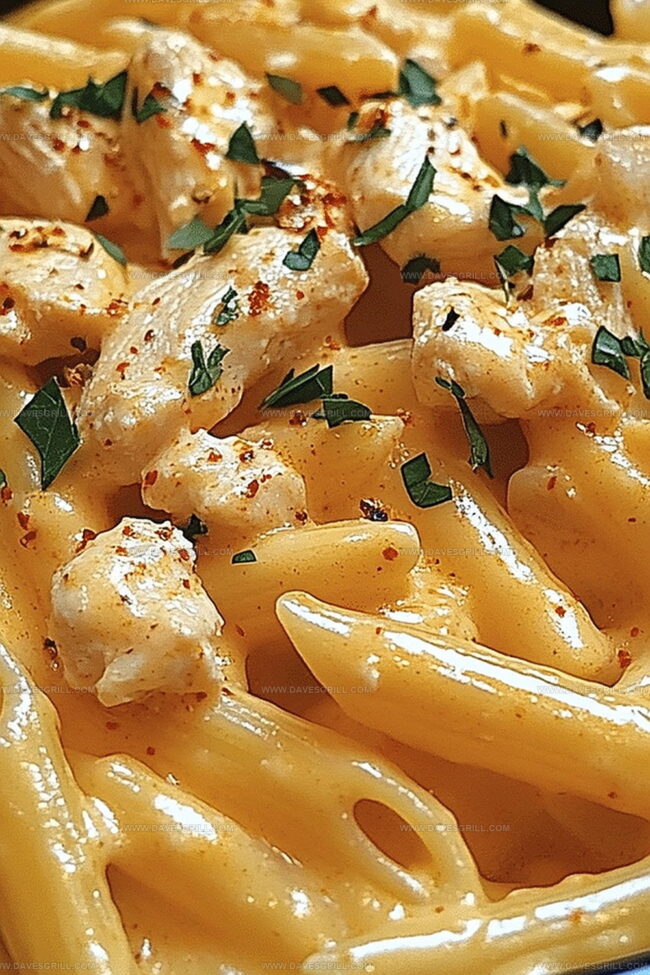 Slide the cooked penne and browned chicken into the luxurious sauce. Swirl everything together so each pasta piece gets drenched in that spicy, creamy goodness.