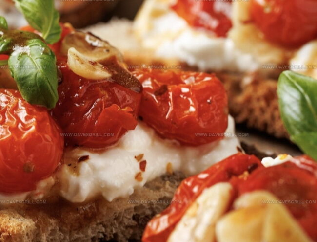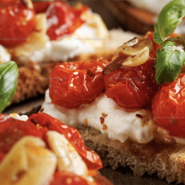 Summer’s delightful ricotta bruschetta with roasted tomatoes offers a perfect Italian-inspired appetizer. Fresh herbs and creamy cheese complement crisp bread, delivering Mediterranean flavors you’ll savor with each delectable bite.