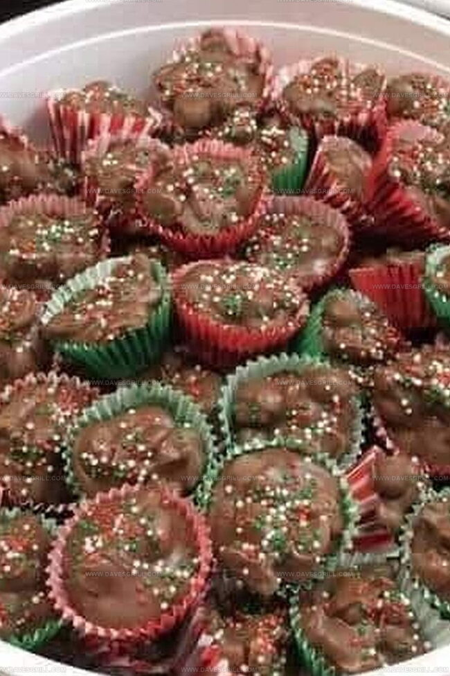 While the chocolate is still warm and glossy, sprinkle holiday-themed red and green decorative sprinkles across the top of each cluster. This adds a magical touch of Christmas cheer.