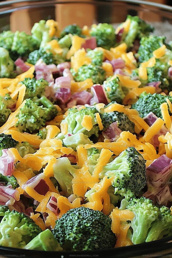 - Ingredient Assembly: In a large mixing bowl, combine broccoli florets, red onion slices, cheddar cheese bits, sunflower seeds, and crumbled bacon, creating a vibrant and textural foundation for the salad.