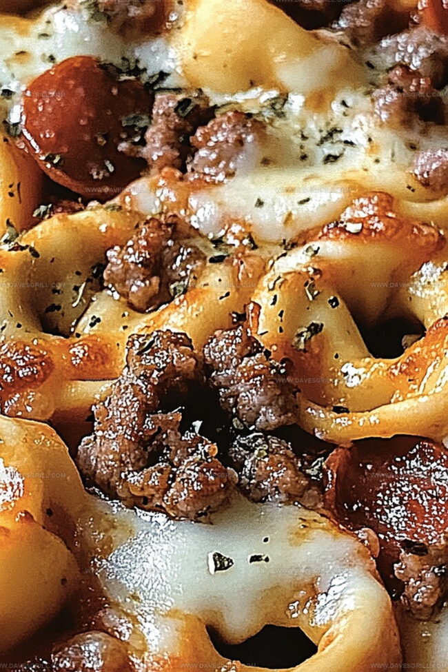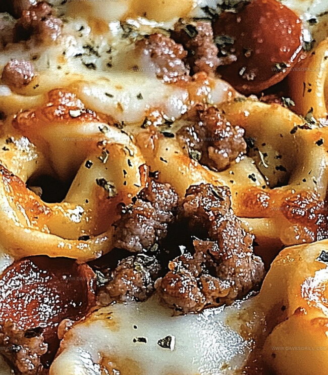The recipe seamlessly blends cheese-filled tortellini with savory pepperoni, crispy bacon, and seasoned ground beef.