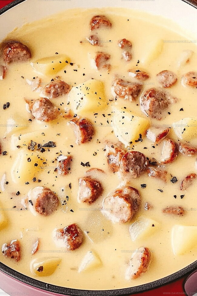 Savory sausage chunks nestle among creamy potato pieces, creating a robust meal that satisfies deep hunger.