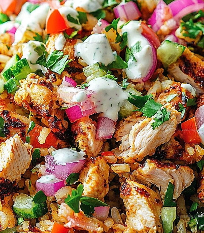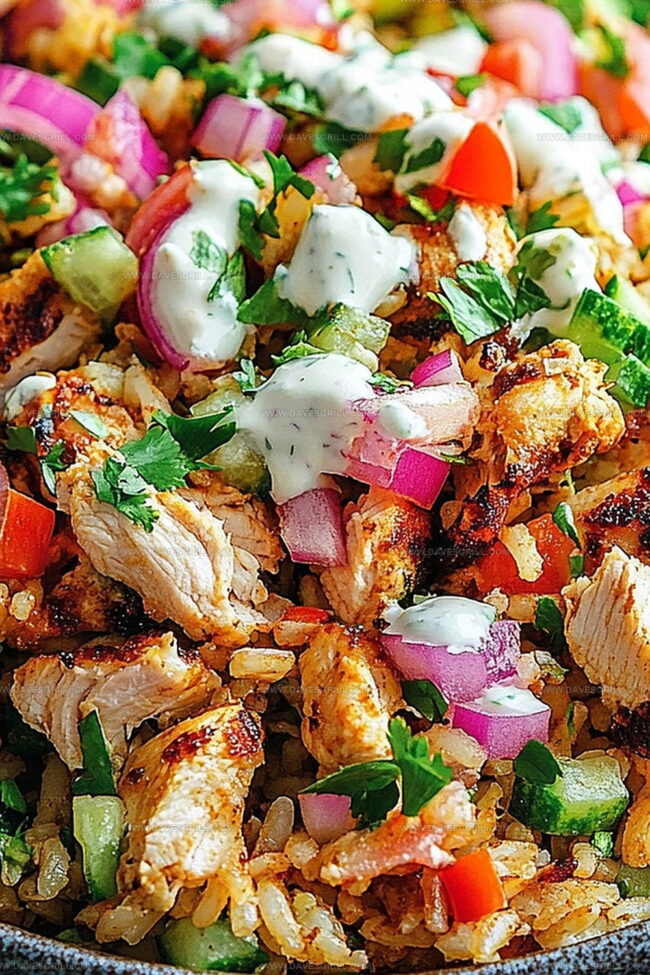 - Construct the final dish by creating a base of crispy golden rice, layering sliced shawarma chicken on top. Generously scatter the fresh vegetable salad over the chicken and finish with a generous drizzle of the creamy yogurt sauce. Serve immediately to maintain the crispness and temperature.