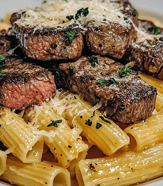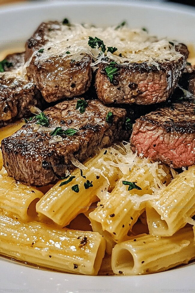 Arrange creamy pasta on plates, crown with juicy steak bites. Scatter extra parsley for a restaurant-worthy presentation. Enjoy immediately while everything is piping hot.