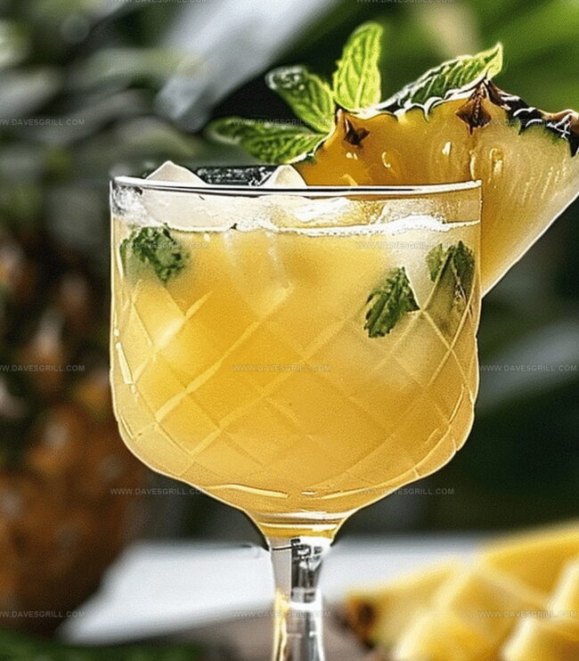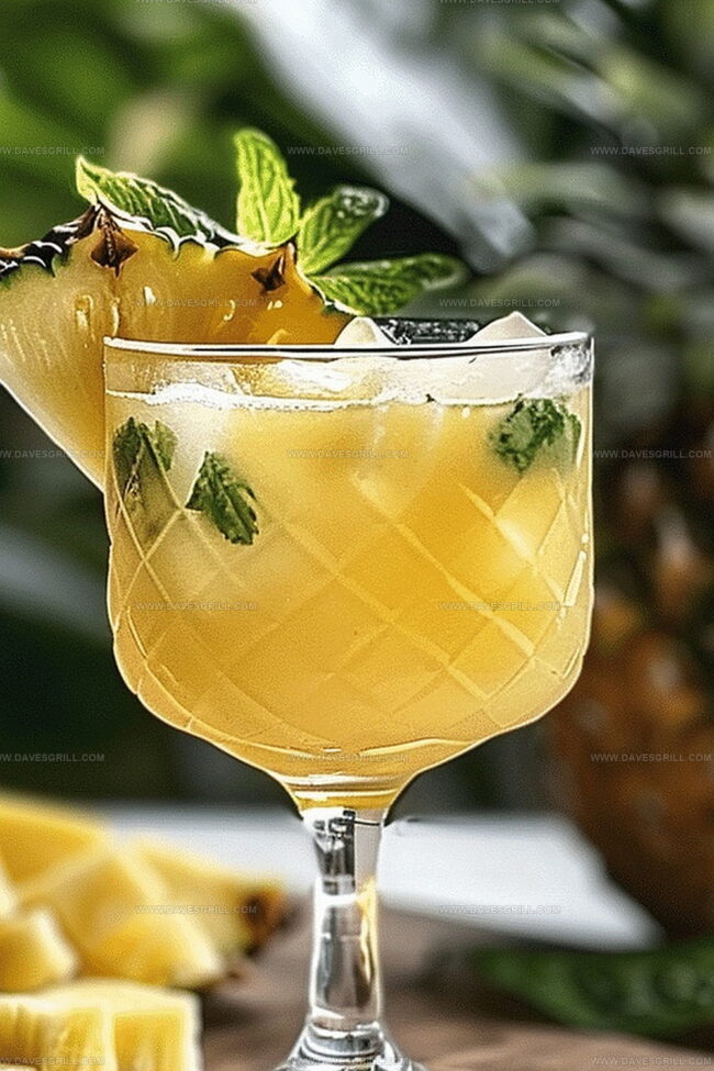 - Garnish the tropical libation with a freshly cut pineapple wedge and a delicate mint leaf, positioned elegantly on the glass rim to enhance visual appeal.