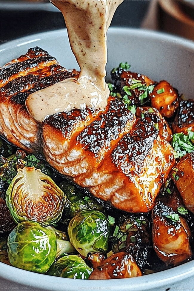 - Assemble Bowls: Layer cooked rice or quinoa in serving bowls, top with salmon fillets and roasted Brussels sprouts. Drizzle remaining teriyaki sauce for added moisture and depth of flavor.