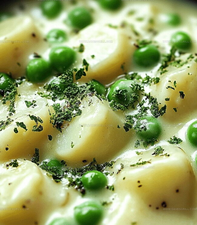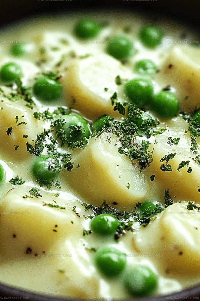 - Garnish and Serve: Transfer the creamy pea and potato medley to a serving dish. Sprinkle with fresh chopped parsley for a burst of color and added freshness. Serve immediately while warm and inviting.