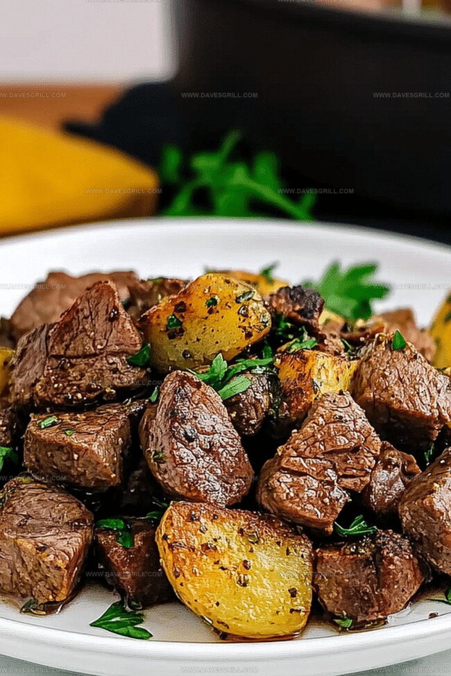- Garnish and Serve: Sprinkle freshly chopped parsley over the dish for a vibrant, aromatic finish before presenting the garlic butter steak bites and potatoes.