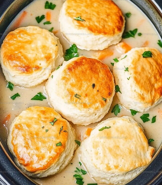 Ladle the creamy chicken mixture into bowls and crown each serving with warm, fluffy biscuits. For an extra touch of freshness, sprinkle some chopped parsley on top. Get ready to dive into a bowl of pure comfort!