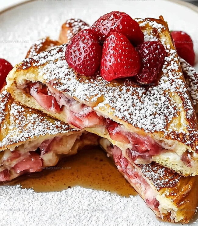 Creamy cheese and sweet berries nestle between golden-brown bread slices, creating an irresistible morning treat.