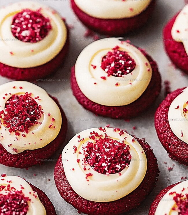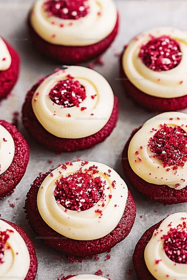 - Cookie Assembly: Portion red velvet dough into tablespoon-sized balls, flattening on baking sheet and creating a base for cream cheese center.